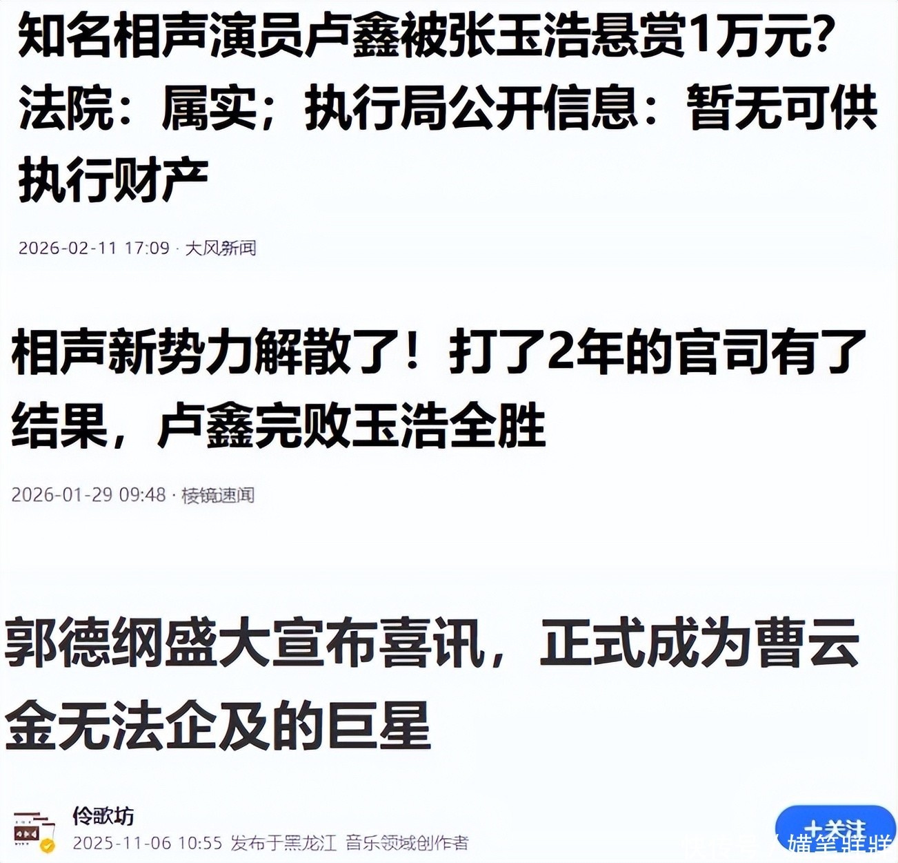 参考资料:大风新闻《知名相声演员卢鑫被张玉浩悬赏1万元?法院:属实;执行局公开信息:暂无可供执行财产》