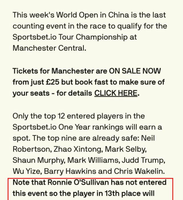 在世界公开赛16强争夺战中,目前排名第13位的中国选手肖国栋不敌张安达,失去了直接进入巡回锦标赛的机会;与此同时,艾伦顺利晋级,进一步稳定了自己的排名。不过,几小时后,世界斯诺克巡回赛事(WST)官宣了传奇球星奥沙利文因个人原因退出本月的巡回锦标赛,这一消息使得肖国栋以第12名身份重新入围,幸运获得参赛资格,令局势急转直下。